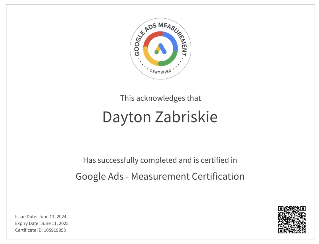 By obtaining my Google Ads Measurement certification I learned how to effectively track and measure performance of Google Ads campaigns. I also learned how to set up conversion tracking which including tracking actions such as form submissions, purchases, and other key metrics. This certificaiton also covered Google Tag Manager and how to implement and manage tags.