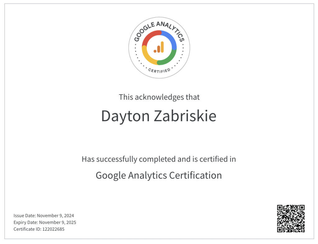 By obtaining my Google Analytics certification I have a strong foundation in using Google Analytics and how to measure and analyze website performance. I also have learned how to segment audiences and create custom reports into specific user groups, which will help identify trends and optimize marketing strategies.